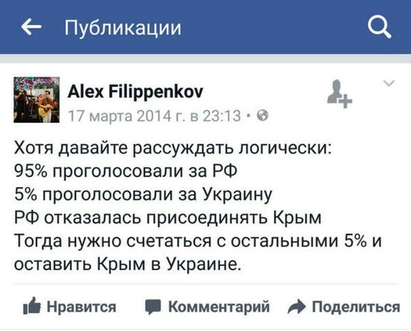 Алексей Филиппенков вообще выглядел в 2014 году типичным «форумным бойцом». Он делился в соцсетях картой мира, на которой вместо России – «Океан мечты». Ставил «лайки» репортажам о бойцах АТО. Выступал против возвращения Крыма в состав России.