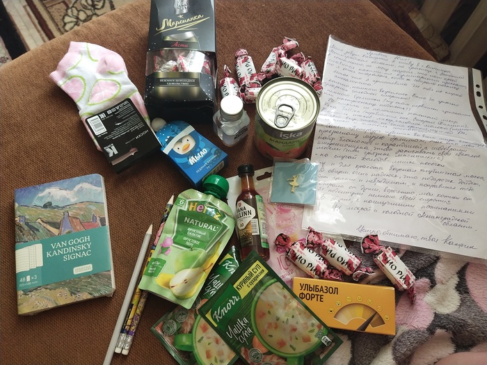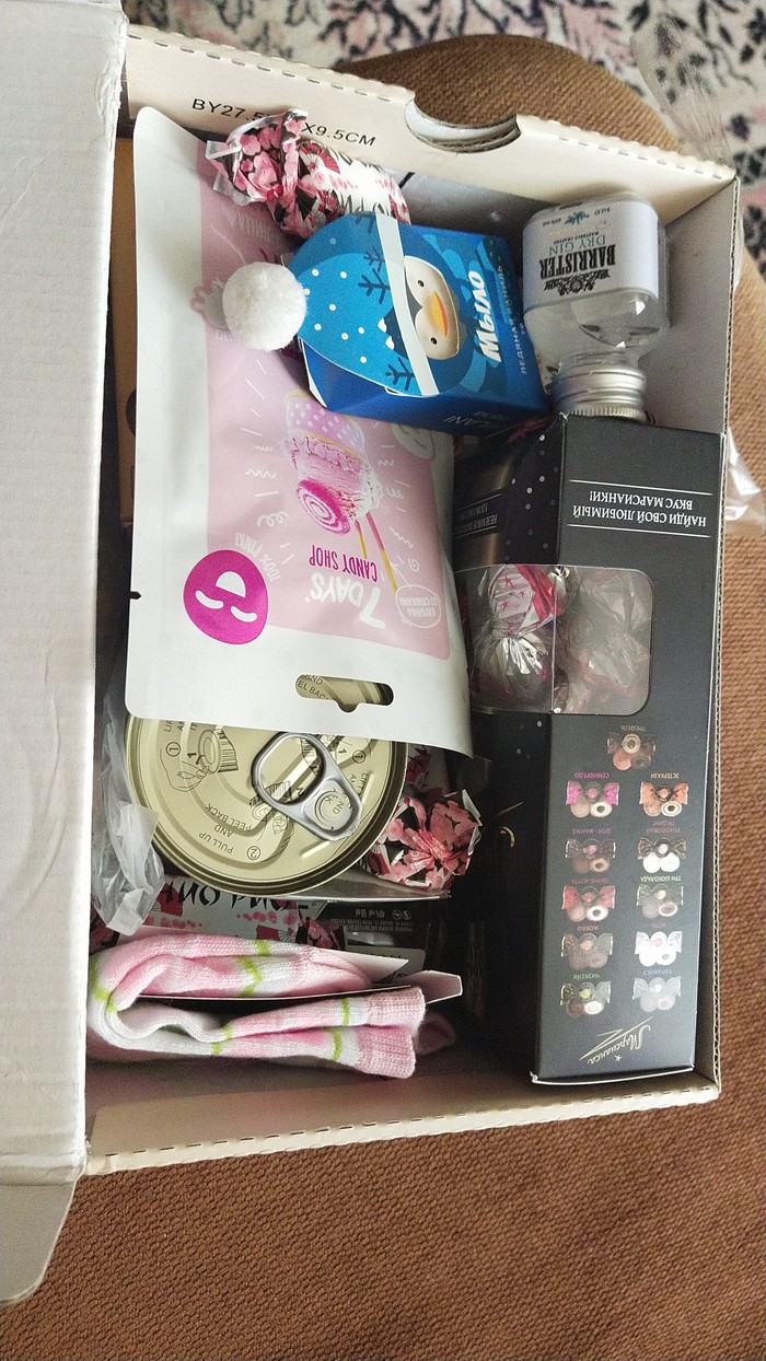 В посылке были конфетки, носочки, Таллинский алкоголь 🙈, маска для лица, мандарины в баночке, блокнотики и карандаши из Эрмитажа)