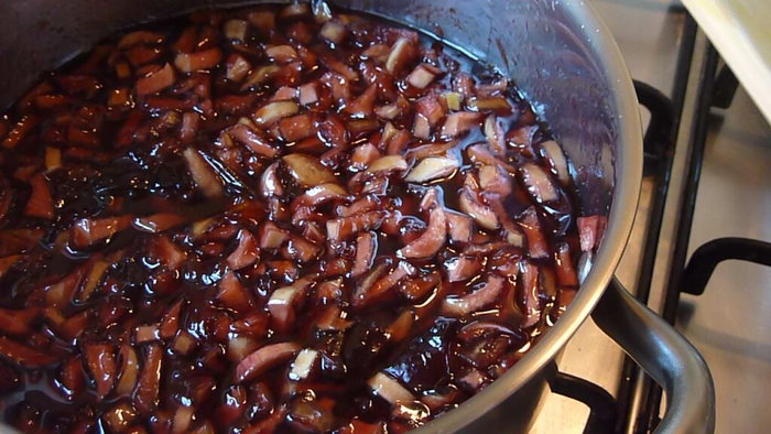 После этого я перекладываю яблоки и сливы в кастрюлю и ставлю на медленный огонь. Варенье начинает закипать. Я его аккуратно перемешиваю. И при медленном кипении оставляю варенье вариться.