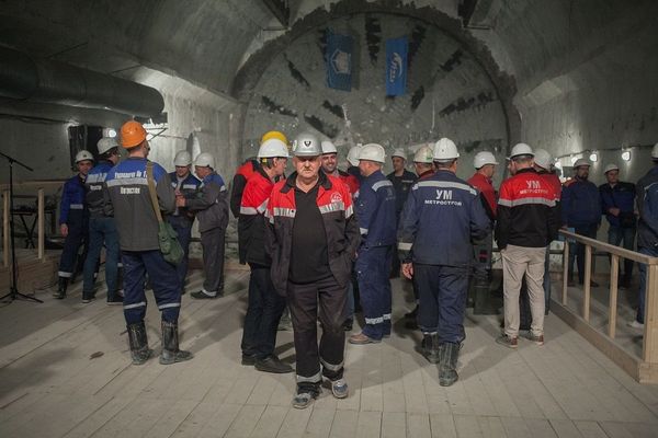 В честь окончания проходки на глубине 50-60 метров состоялась торжественная церемония. Любопытно: для того, чтобы спуститься под землю, метростроевцам приходится сначала подниматься на пару лестничных пролетов, где установлен специальный лифт с двумя независимыми камерами, которые и доставляют сотрудников на рабочее место - в тоннель, где уже совсем скоро будут ходить современные быстрые поезда, а в "тёплых" вагонах - ехать петербуржцы.