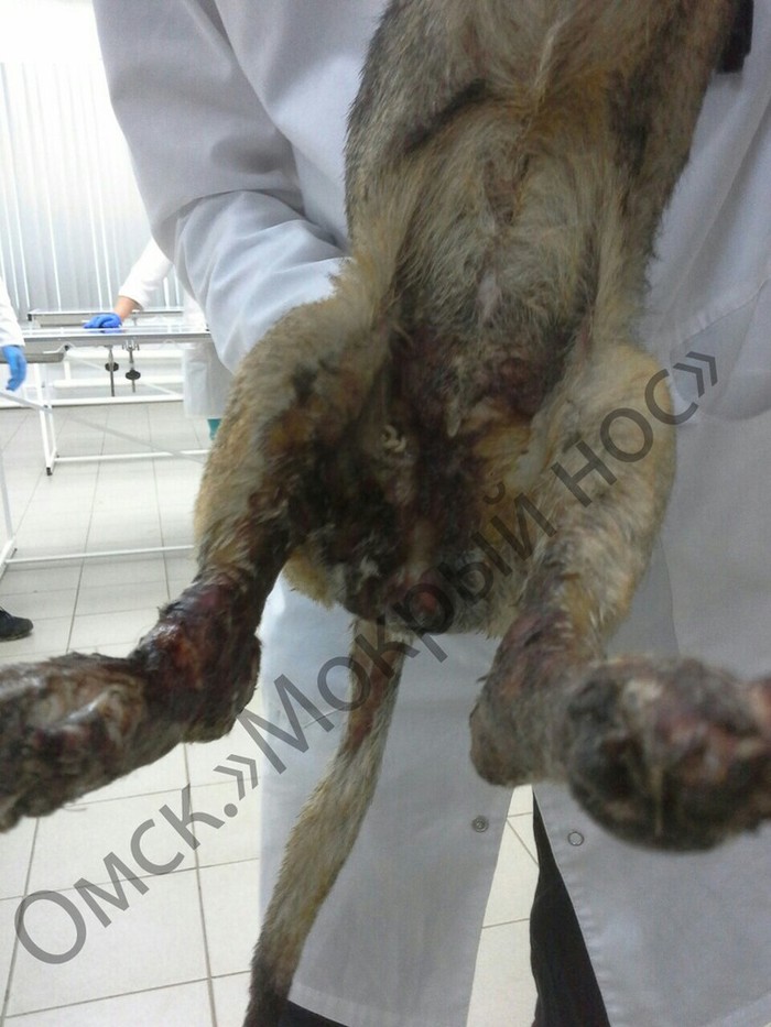 "Только за то, что щенок мешал ей пройти, а ведь щеночек то размером с кошку… Всё это произошло на глазах у местной ребятни. Мальчишки пытались вытащить щенка из огня, но женщина не давала подойти к бочке, орала матом. Как и кто вытащил собаку – неизвестно, но спасибо огромное этому человеку. Односельчане осудили женщину, и, чтобы избежать дальнейших конфликтов, она принесла сожженного щенка к себе во двор и посадила на цепь. Никакая помощь и лечение собачке не оказывались. Но информация прошла в Интернете, поднялся скандал. И тогда собаку просто взяли и выкинули за калитку. Сейчас лето, мухи, а у собаки открытые раны. Через неделю несчастную съедали опарыши. Спасибо неравнодушным людям, которые почистили и первично обработали ожоги, спасибо тем, кто привез собаку в Омск! Щенок осмотрен в клинике ветеринарного института, там же он оставлен в стационаре. Состояние собаки не оставило равнодушным никого. Маленькая коробка, а из неё выглядывает симпатичная, лопоухая мордашка с обожженным носом. Вроде не так и страшно. Но стоит заглянуть в коробку поглубже, и мороз по коже … Там лапы, сожжённые почти до кости... все четыре лапы... От такого вида перестаешь дышать."