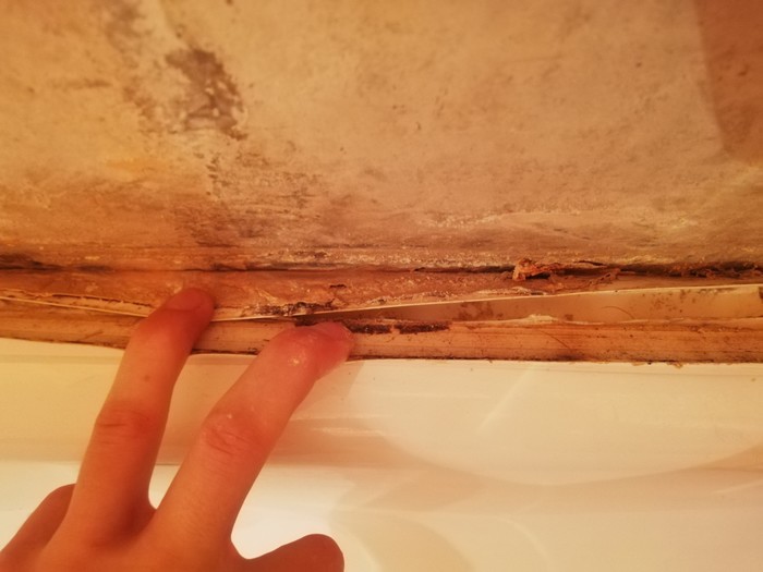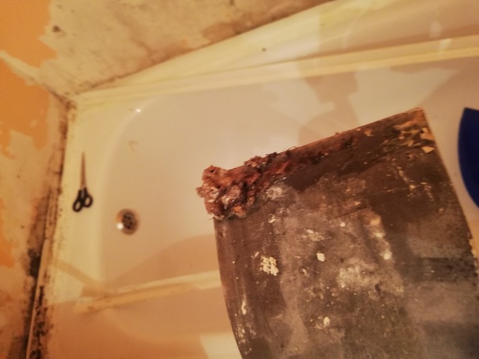 Меня попросили сделать подкраску в ванной комнате, т.е. снять обваливающуюся краску и наложить новую. +грунтовка и шпатклевка. Обычно я за такую работу беру минимум - 500 рублей. (Это включает съездить в магазин (чаще всего отказываются), покупку материалов, зачистку, грунтовку, шпаклевку и покраску). Но то, что я увидел повергло мен в шок. Вот фото после зачистки.