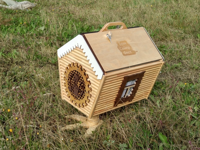 Как красиво обыграть черепицу я не придумал, поэтому просто наносим на крышу логотип фестиваля. Работаем с начинкой - крепим трансформатор, конденсаторы, подбираем радиатор для усилителя. Соединяем меж собой плеер, резистор для регулировки громкости, dc/dc конвертер.