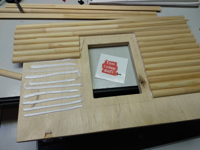Рисунок штор я напечатал на бумаге - надо будет делать его из ткани - смотрелось бы гораздо солиднее. Собираем вчерновую, находим ошибку - меняем форму прорези, делаем новую деталь, заливаем внутренние части лаком.