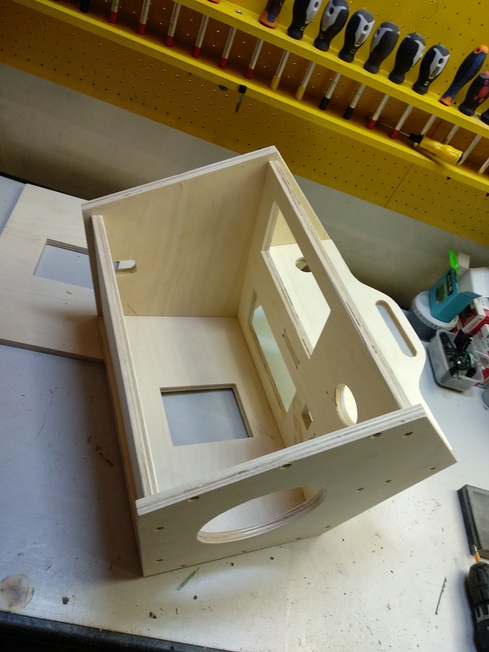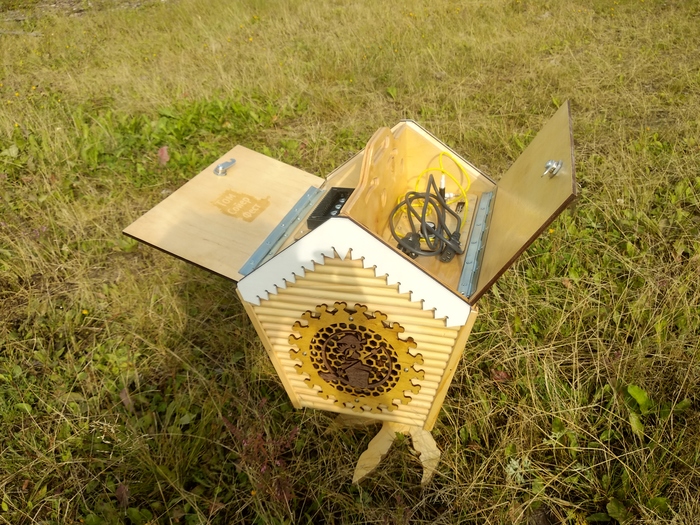 Идея простая - крыша откидывается - два отсека, в одном все органы управления, во втором радиатор охлаждения усилителя. В каждом отсеке по розетке для зарядки, у каждого отсека свой ключ. Можно оставить заряжаться телефон в одном отсеке, в то время как во втором лежит другой телефон который играет музыку по проводочку. Идем скрести по сусекам:
