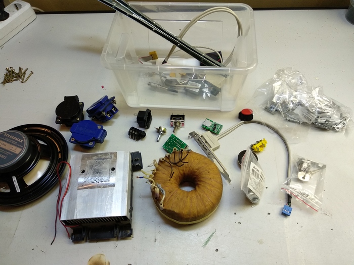 Хотелось максимально использовать хлам, что скопился на работе, если колонку нужно будет производить серийно (если вдруг образуется очередь из Фраев с деньгами как на известной картинке) - то проще воткнуть автомагнитолу - в ней уже все есть. Используем: Динамик 90 китайских ватт 4 Ом, трансформатор от проектора Радуга 4 для питания всех цепей, розетки от бензиновых генераторов, пара диодных мостов, конденсаторы, переменный резистор для регулировки громкости, китайский модуль mp3 плеера, панелька с USB разъемами от компьютера, dc/dc понижайка для питания электроники 5В, RGB лента с контроллером, разъемы jack 6, тюльпаны, тумблер для переключения источника сигнала, клавишный выключатель, силовой разъем для подключения питания, алюминиевый радиатор. В качестве УНЧ нашлась плата от Мастер Кит a2033 - УНЧ на 100 Вт требующий двухполярного питания. Хотя в целом все зависит от того, что найдется в хозяйстве и сколько времени вы готовы потратить, повторюсь - автомагнитола имеет на борту все что нужно, только добавь питание (если поставить импульсный блок питания, можно использовать колонку как оружие массового поражения в толпе аудиофилов).