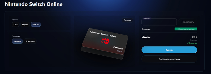 На Code-top.shop можно оформить коды для подписки Nintendo Switch Online на 3 и 12 месяцев, что удобно, когда не хочется подбирать номинал подарочной карты и отдельно оформлять покупку в eShop. Доступны варианты под популярные регионы: США, Европа, Польша.