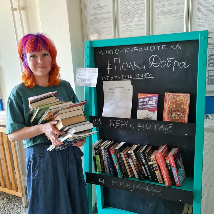 Для сбора книг мы организовываем акции в книжных магазинах. Например, чтобы передать новые книги в ДГБ№1 , там, где лежат дети с онкологией. Мы установили им вот такую Полку Добра и регулярно пополняем ее свежими книгами. На фото Полка из деревни Агалатово, если что. Но в больницу мы поставили похожую - нам туда входа нет, передали через родителей детей.