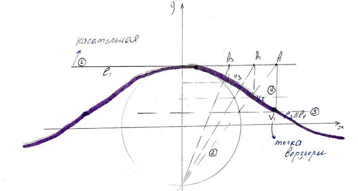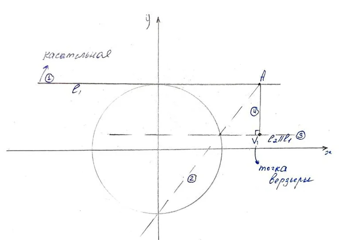 2. Берем произвольную точку А на касательной l1 и проводит через неё прямую в точку, диаметрально противоположную точке касания.