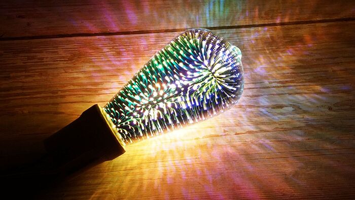 Удивительные светодиодные лампы имеющие специальное зеркальное покрытие с внутренней стороны колбы. Когда лампа включена, создается красочный эффект фейерверка, исходящего из самой глубины лампочки. Визуально чередующиеся многократно трассы точек и звездочек выглядят действительно трехмерными причем под разными углами. Эффект проявляется ярче, если перемещать и вращать лампу перед глазами из стороны в сторону. Мощность лампочки составляет 6Вт, яркость невысокая за счет покрытия, поэтому можно использовать в качестве необычного ночника. На странице товара очень большой выбор форм колб, в том числе весьма неординарных, например, в виде елочки, звезды, сердечка или пирамиды.