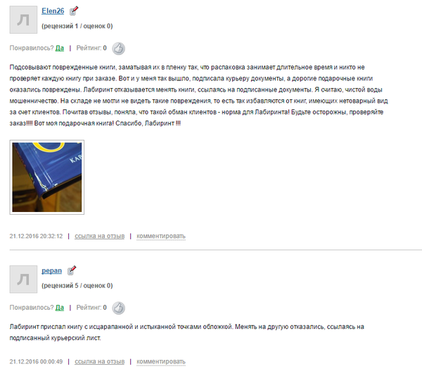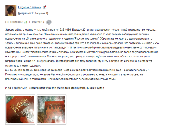 Соответственно таким образом один из крупнейших книжных магазинов в России просто забивает на клиентов. Как я сказал в начале: в этом случае почти целиком моя вина, ведь мне в голову не пришло на месте сразу проверить товар или снять видео распаковки, но отношение магазина к подобным вопросам я считаю наплевательским. Как я узнал чуть позже: мой случай не единственный. Вот несколько первых отзывов о работе магазина.