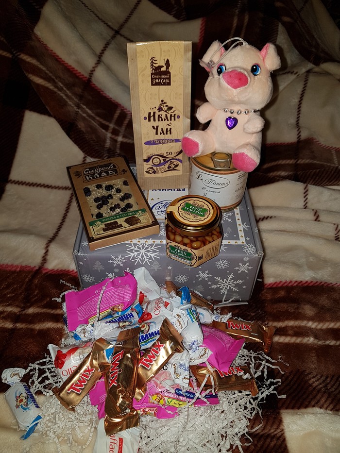 Ко всему этому прилагалась милая свинка и кучка конфет (ну, чтоб прям однозначно всё слиплось 😁). Но их можно увидеть только на общем фото. По тому, что свинку забрала доча и отдавать категорически не собирается. А конфеты... Перефразирую старый анекдот: "Конфеты они и есть конфеты. Что на них смотреть? Их есть надо."