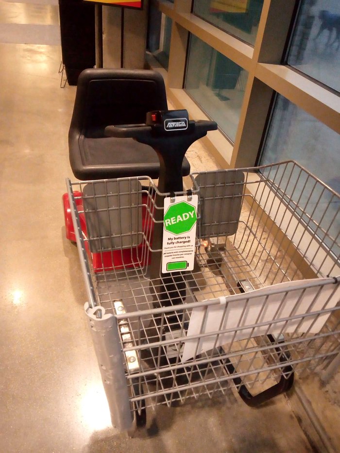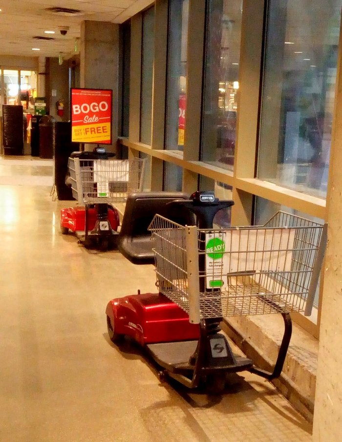 продуктовая, но не простая, а на батарейках и с возможностью ездить на ней верхом (обычные корзины и тележки также имеются, но не представили документальной ценности). Это для людей с ограничением в передвижениях. Надо сказать, что здесь инвалидные коляски сами по себе бывают моторизированные, человек сам на ней, в-одиночку, как на машине, по улицам ездит по своим делам.