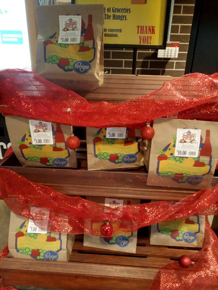 Это стенд с бутафорскими пакетами разной стоимости - просто берёшь его и либо кассир его "проводит", благодарит и забирает обратно, либо сам, без лишнего пафоса, "считываешь" в кассе самообслуживания и оставляешь на выходе. Собранные средства идут в банки еды, которые распределяют продукты питания среди тех самых, "less fortunate people", "кому меньше повезло".