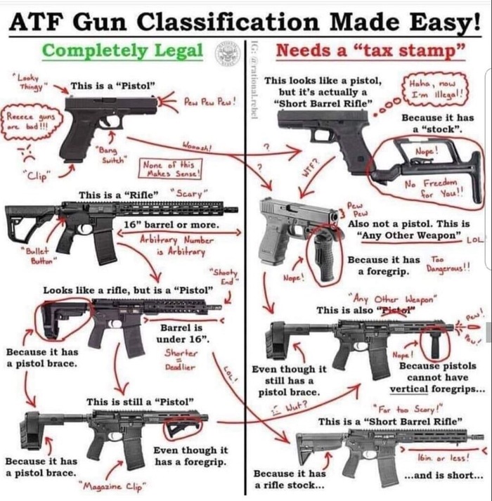 На эту тему есть отличная картинка. Слева – легальное оружие, находящееся в свободном доступе. Всё что справа – регулируется NFA и требует специального разрешения.