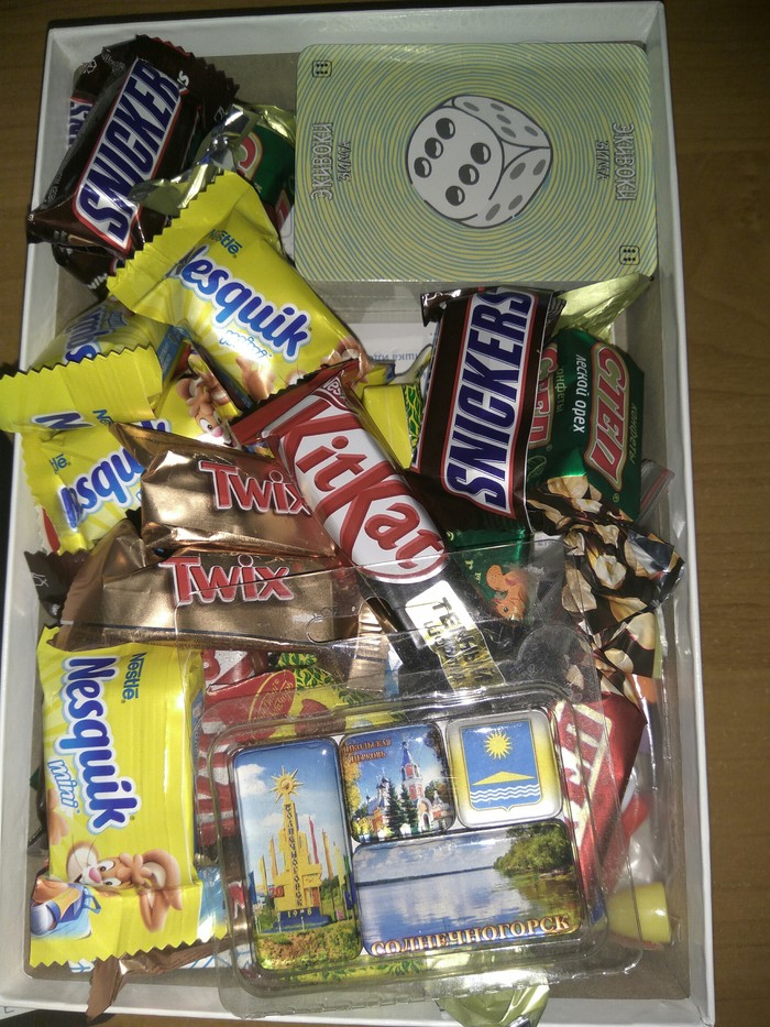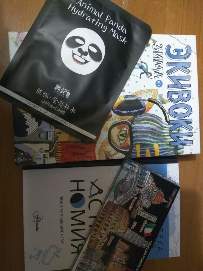 Коробочка была весьма увесистая. Внутри оказалась книга "Любительская астрономия", итальянская шоколадка и настольная игра "Экивоки". Есть даже маска панды для жены)