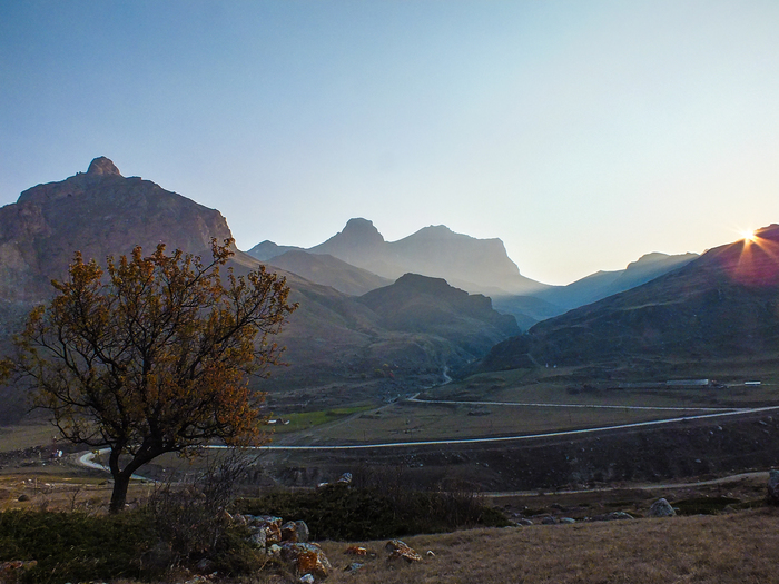 Восход над селом Эль-Тюбю. Дорога в урочище Думала. Там находится старое село Думала. В нем жили балкарцы до выселения в Казахстан, которое произошло 8 марта 1944 года.