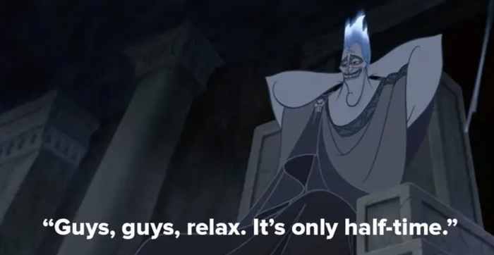 В мультфильме "Геркулес" (1997) Аид говорит: "Ребята, расслабьтесь. Это всего лишь халф-тайм" ровно на 46-й минуте, то есть на половине 92-минутного фильма.