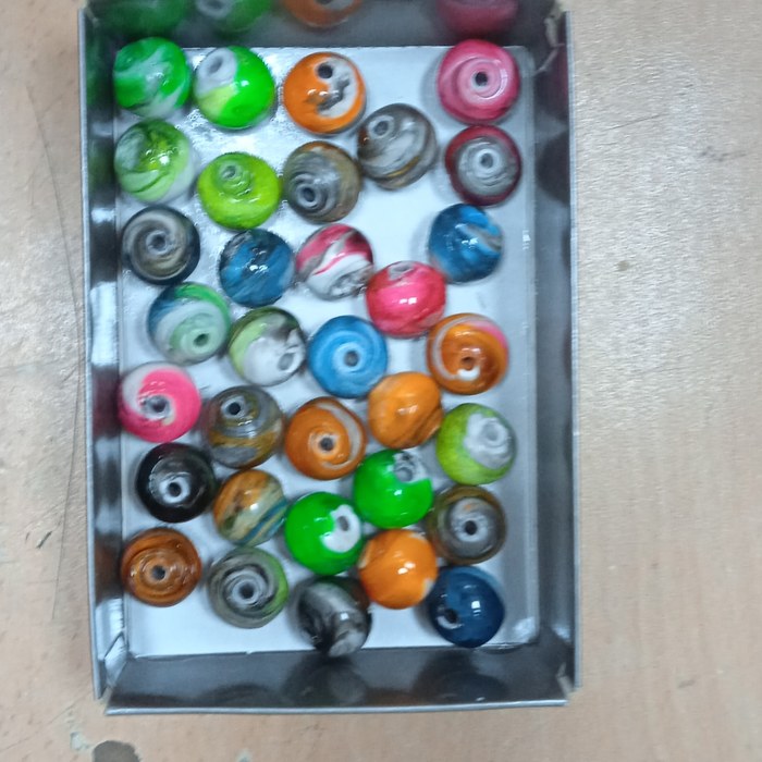Первые шарики не особо получались, вместо того чтоб плавится пластик горел и вонял. Потом надо было понять какое количество пластика надо на шарик. В моем случае это было высчитано экспериментальным путем, половина ложки и две шпажки. Ну а дальше дело пошло веселее. Платим ложку и наматываем её на отвёртку, потом придаем форму пока черновую и добавляем цвет шпажками. Катаем шарик в приспособе. Греем и катаем до тех пор пока на получится удовлетворительный результат.
