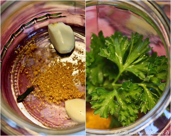 В каждую, значит, баночку кладем одну гвоздичку, кофейную ложечку (тут опять же дело вкуса) карри, пару зубчиков чеснока. Веточку зелени.