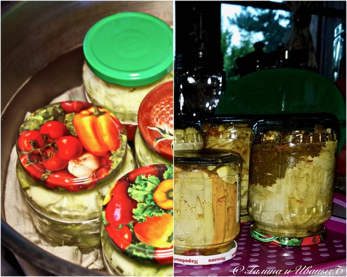 Потом накрываем банки крышками и подвергаем будущий консерв стерилизации. Совершенно обычным способом.