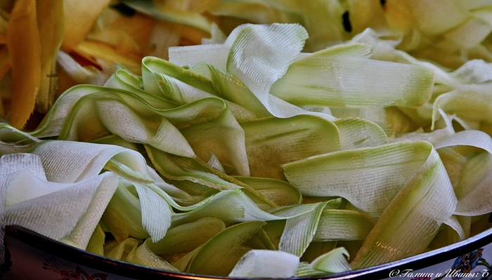 При помощи всем известного нехитрого девайса, овощечистки, то бишь, все заготовленные кабачки вот таким образом … ммм … настружим. В общем, Изведем, в общем, плоды на тонкую стружку.