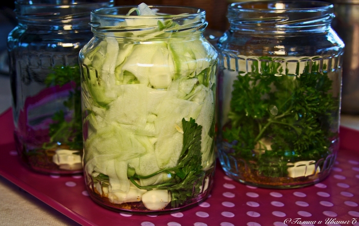 А потом набиваем банку стружкой кабачковой. Плотно. НО! Без излишнего фанатизма, чтобы, значит, не помять стружку сильно.