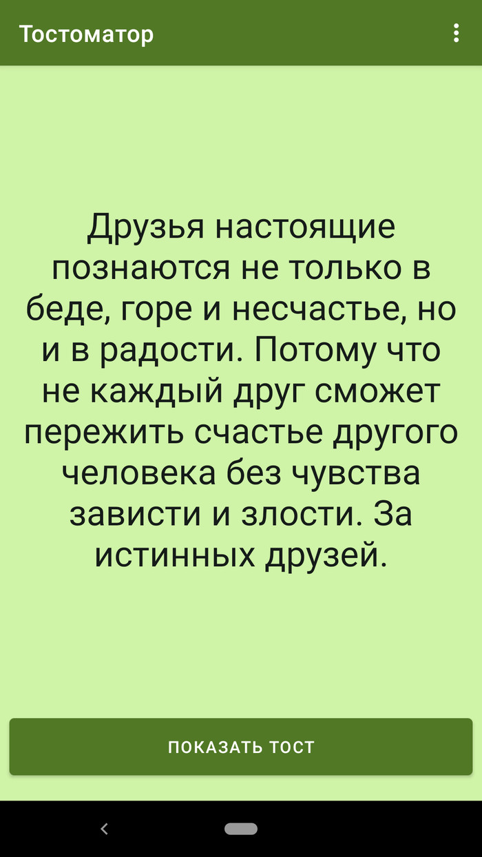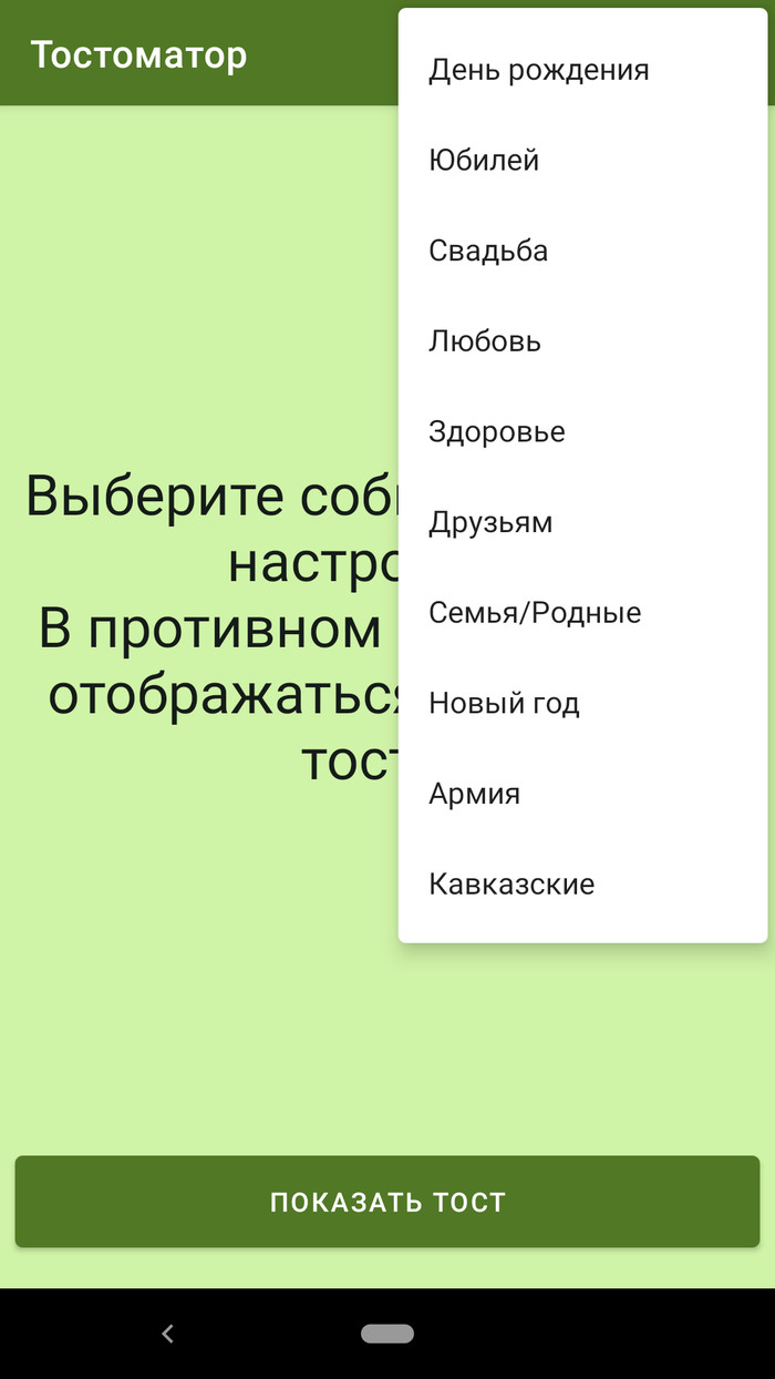 Взаимодействие человека с приложением организовано с помощью единственной кнопки «Показать тост» и раскрывающегося меню, расположенного правее заголовка приложения, с помощью которого можно выбрать подходящее событие. Соответственно давать дополнительные инструкции по использованию приложения нет необходимости. Работает пока только на смартфонах, планшеты не предусмотрены, но такая возможность появится позже. Только портретной ориентация, так удобнее, в альбомной я посчитал, что смысла особого нет. Предлагаю посмотреть скриншоты.