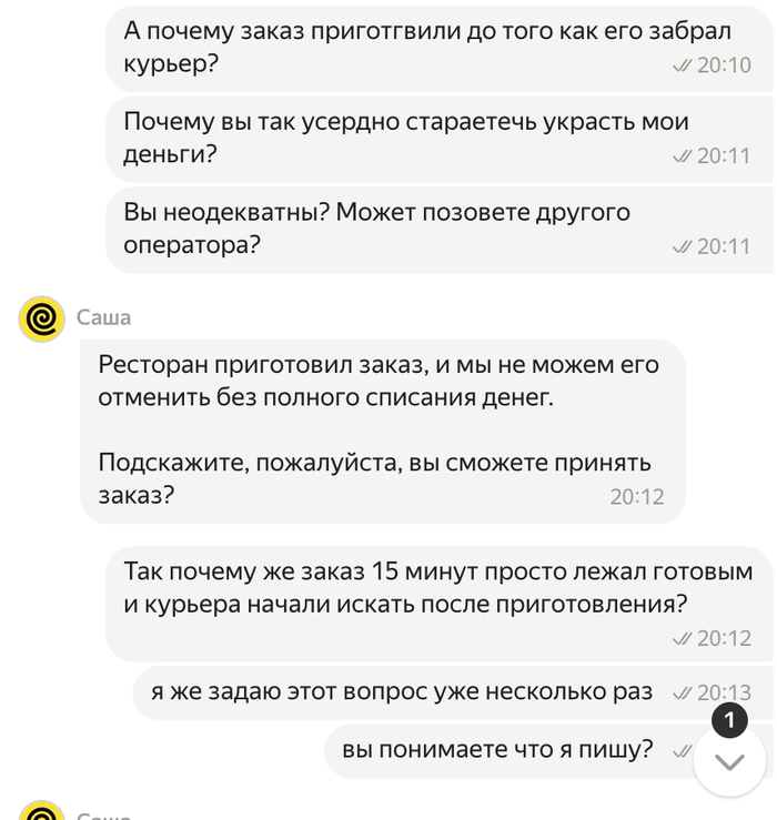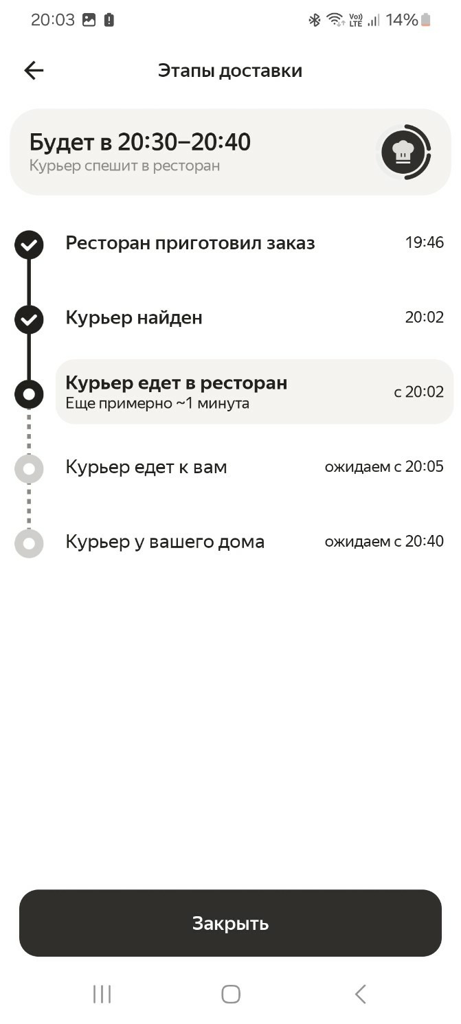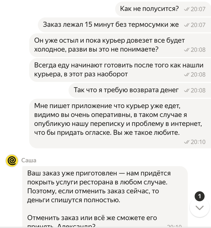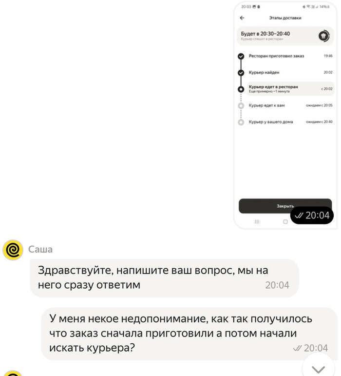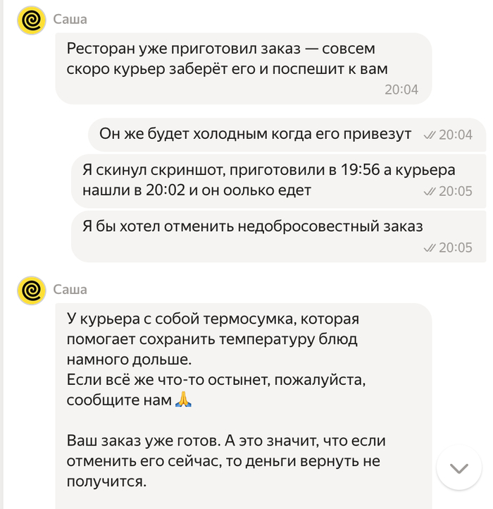 Т.е. 16 минут заказ тупо лежит остывает в 20:02 только находят курьера и он только едет (всегда сначала находят курьера а потом начинают готовить, тут видимо на каком-то этапе произошел сбой, но техподдержка решать проблему не стала хотя я им об этом заранее написал), курьер в итоге приехал в 20:41 с холодным заказом и без термосумки.
