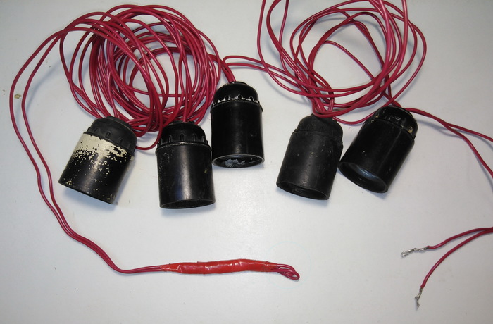 Беру пяток патронов (нет-нет, автомат не беру, шутка за 3 копейки), нахожу длинный гибкий одножильный (многопроволочная жила) провод.Недолго думая, складываю его вдвое. Примерно на равных расстояниях закрепляю патроны. Вкручиваю лампы накаливания (да-да, тогда их еще не запретили). Монтирую вилку. Получилась совершенно замечательная гирлянда с очень удобной петелькой на другой стороне от вилки. Цепляю гирлянду этой петелькой за крючок. Включаю в розетку. Хорошо, что испытывал не при маме!