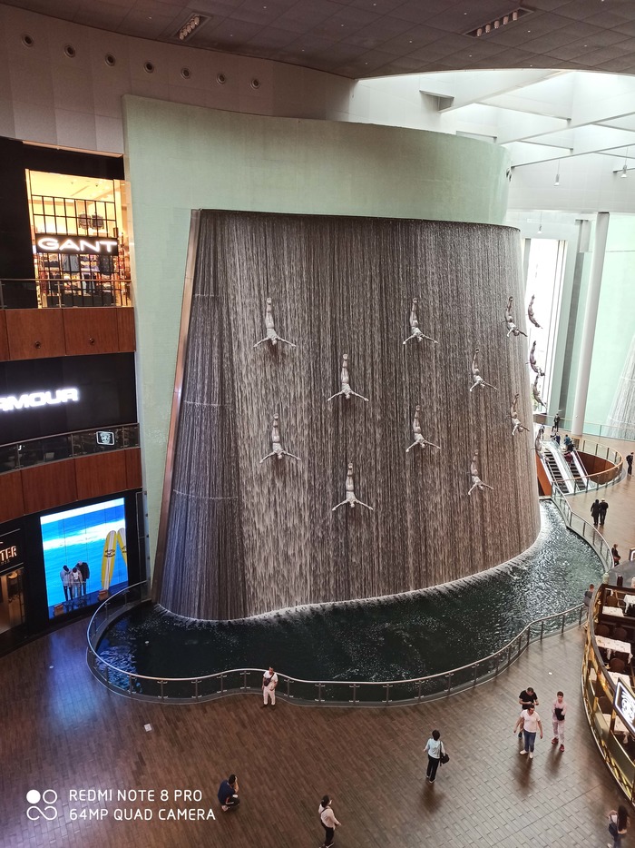 фото из Дубай молл. Водопад с изображением ловцом Жемчуга. Когда в ОАЭ еще не добывали нефть, чуть ли не единственным источником дохода был жемчуг, который плавцы добывали в Персидском заливе.