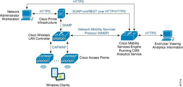 Ещё раз: никакого спецоборудования, обычные точки Wi-Fi Cisco и софт для обработки их логов. От модели точки доступа Cisco зависит точность. В нашей схеме нужен ещё аплинк до сервера аналитики, где также развёрнут виртуальный контроллер Cisco — точки сгружают ему логи.