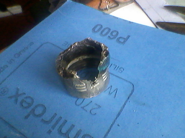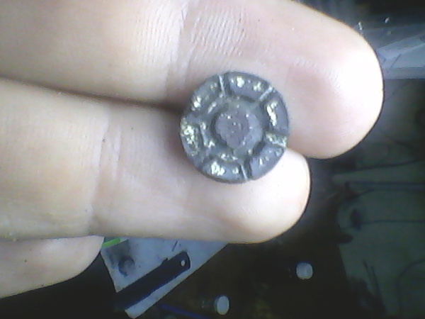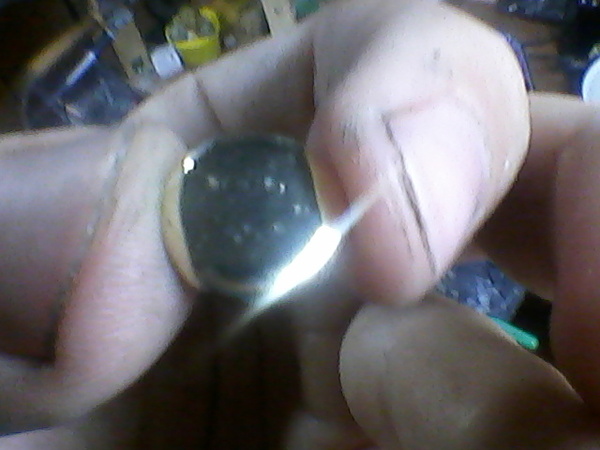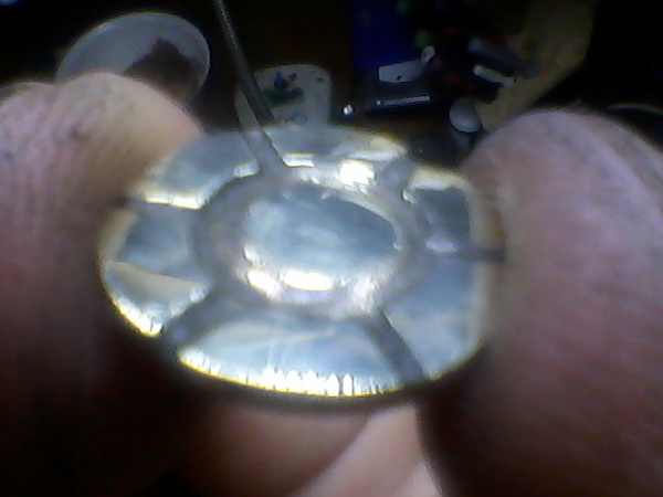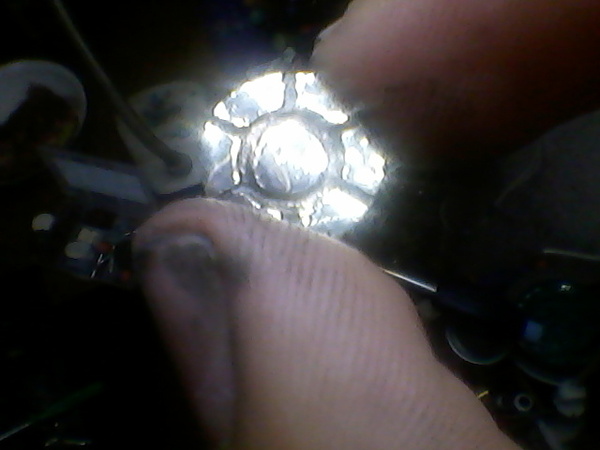 Когда я формиовал опоку, опока это в чем отливается ювелирное изделие, я взял железный фонарь ( на самом деле корпус фонаря был сделан с алюминия, в будущем оно дало о себе знать) и разобрал его, замерев мне нужную часть для опоки я отпилил ёё ножовкой по металу, за формировав опоку и дав постоять ей 2 часа, я начал потихоньку её прокаливать. Прокалив опоку до нужно температуры, я закинул в неё метал и начал его плавить, при плавление метал в опоке, опока начала потихоньку плавится, увидив это я сильно запаниковал. Когда метал расплавился я сразу придавил её "картошкой", но не совсем картошкой. При окончании литья вот что стало с опокой