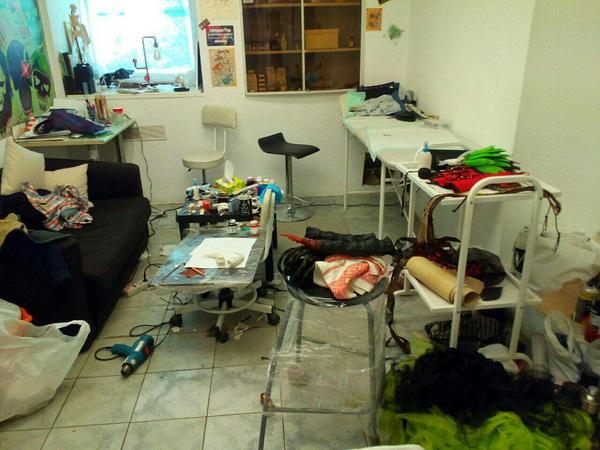 Моя маленькая мастерская была покрыта более чем полностью перьями, обрывками ткани, бусинами, веточками, ниточками всех цветов и размеров, короче ад на земле в отдельно взятом помещении.