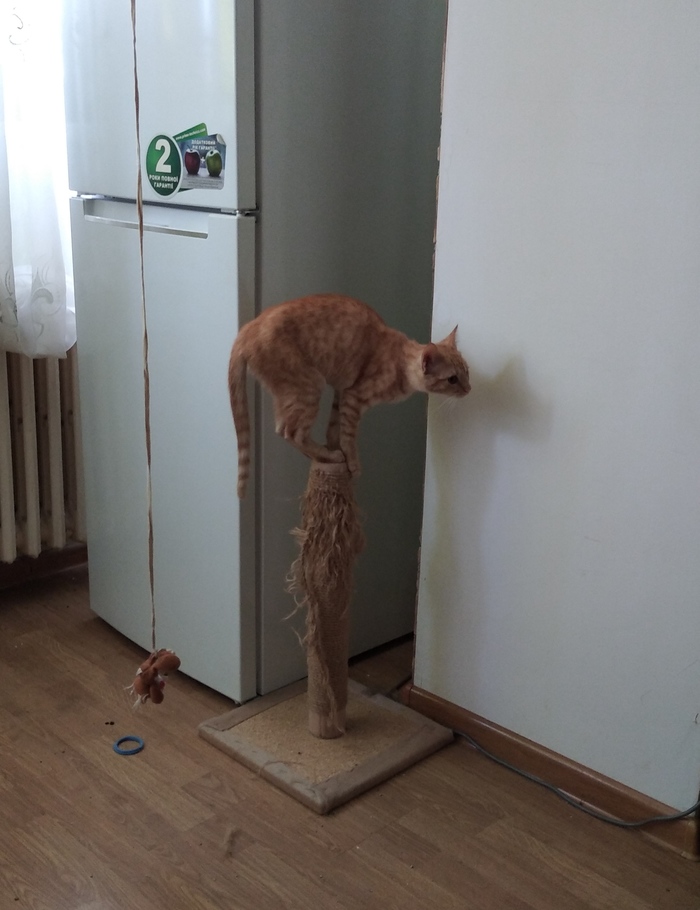 Девочка, конечно, оказалась с лёгкой придурью. Иногда пытается нападать и грызть кота, при разнице в весе около пяти кило. Кот на такое недоумевает и прячется где повыше, а оттуда жалобно мявкает) но рыжая уже начинает брать высоты)