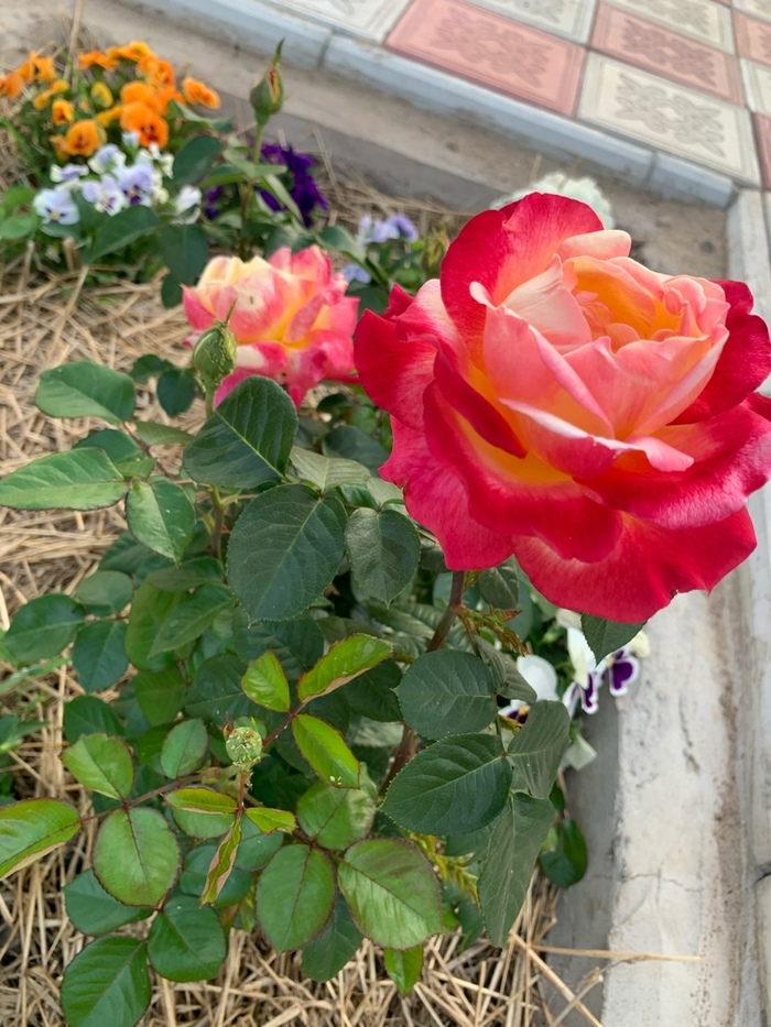 Цвет - сливочно желтый с широкой окантовкой малинового цвета.