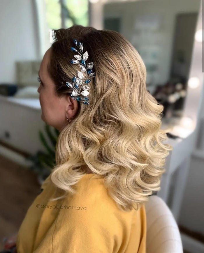 Хочу показать очень красивую прическу "голливудская волна" - так называются эти локоны и веточку ручной работы. Металлическая фурнитура, ювелирная проволока, хрустальные бриолеты.