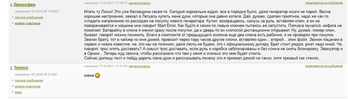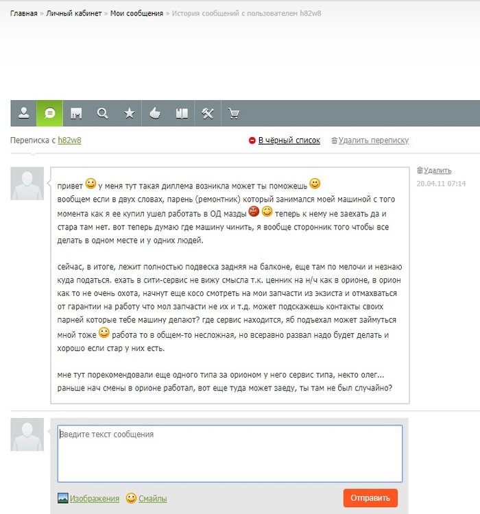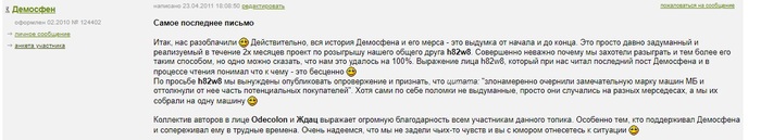 К тому времени мы уже начали переживать что нас раскрыли. Однако же нет, 20 апреля Денис сам пишет в личку Демосфену письмо и как опытного уже пользователя Мерседеса и всех сервисов в городе просит совета:
