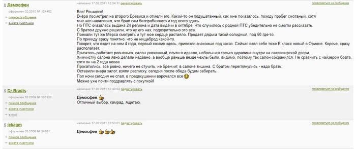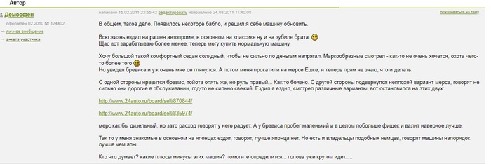 15 февраля 2011 года на форуме пользователь с именем Демосфен создает новый топик, (это ссылка с пруфами что история настоящая, далее я просто приведу несколько скринов для иллюстрации) с темой “Не могу решить что взять? mercedes E200 или toyota Brevis...” где описываются муки выбора между двумя совершенно разными автомобилями.