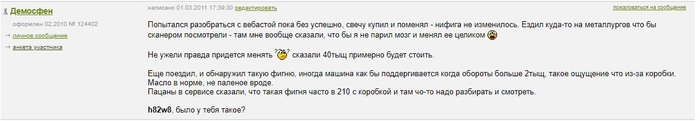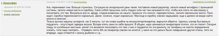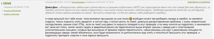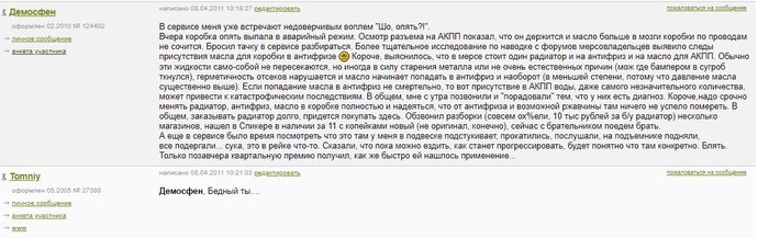 Жидкость из АКПП оказывается в антифризе. Ну и начинает рейка рулевая стучать. Демосфена уже жалеют и выказывают поддержку "Дружище крепись! Зато все замененное еще 10 лет отходит, а то что вложился машина тебе сполна отплатит комфортом Все нормально - главное руки не опускай!"