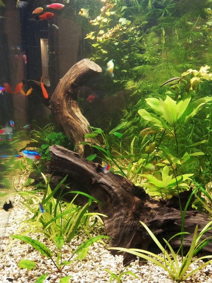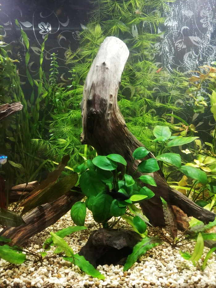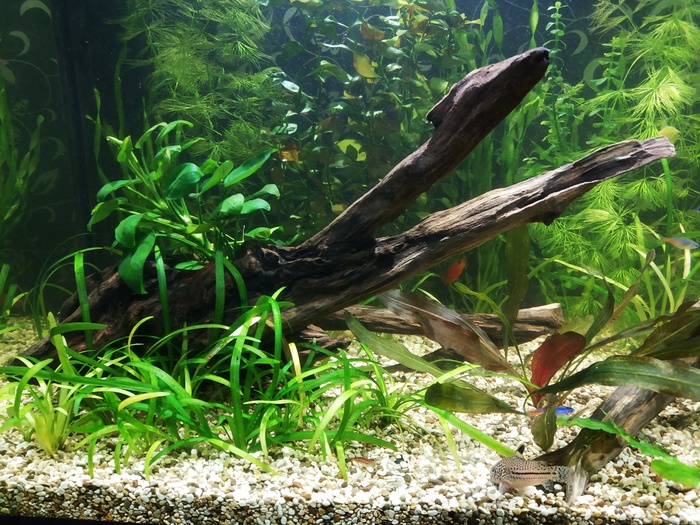 Месяц я приводил экосистему в порядок. Растения разрослись густо, начал их обрезать и полоть. Хотя лично мне кажется, что света маловато, а они прут без всяких прикормов. Обычную корягу заменила красивая, с сквозным туннелем и открытым низом. Сомы остались очень довольны)) они, кстати, выросли практически вдвое с момента покупки.