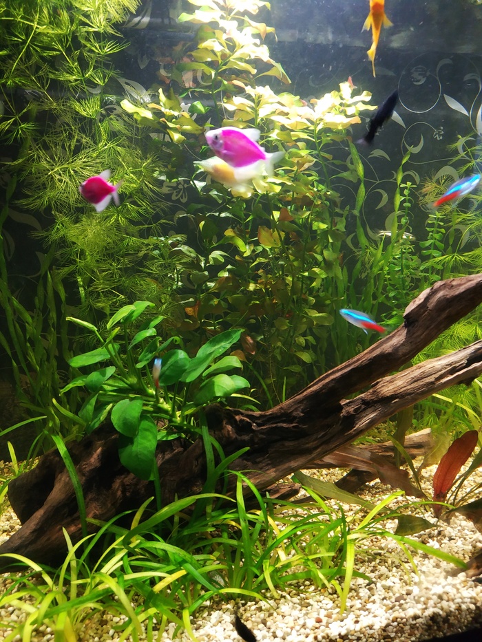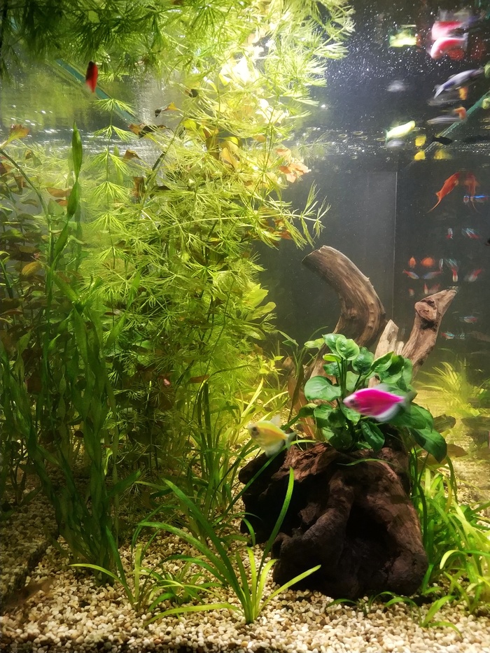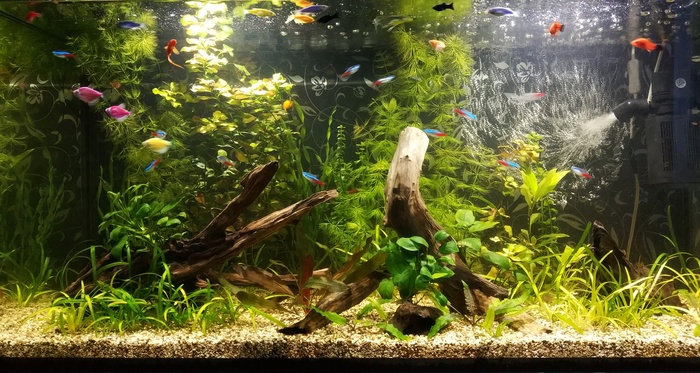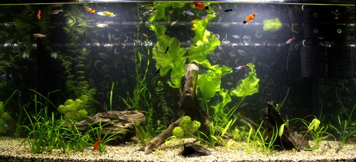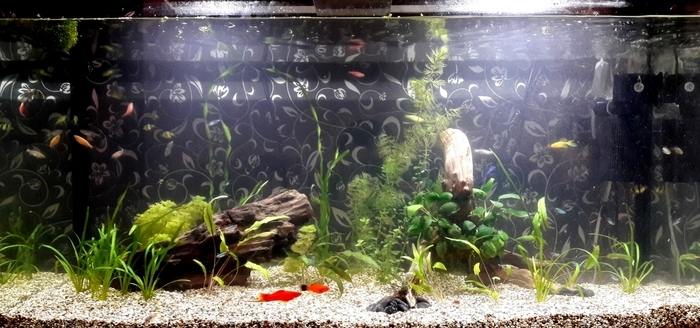 Жители: 4 коридоса 2 присоски, 3 водорослиеда, 4 молинезии, 1 родомостомус, 9 данио, 11 неонов, 3 меченосца, 5 тернеций, два десятка креветок.