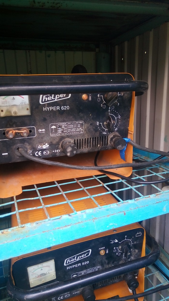 Я меняю севший аккумулятор на заряженный, который беру из ящиков, оборудованных щипцами и подачей тока.