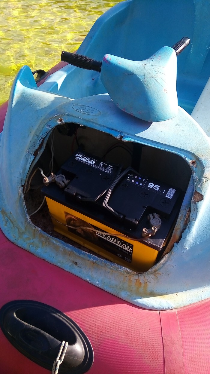 Это лодка со снятой головой. Аккумулятор больше автомобильного, весит около 25 кг. 95 ah, 12 V.