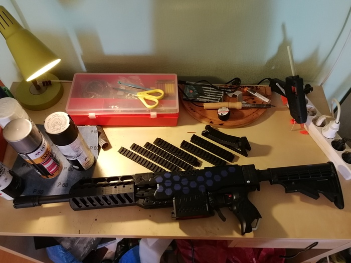 На печать ушло примерно 30 часов. был напечатан переходник с нерфовского дула на цевье, само цевье, дульный тормоз, куча планок Пикатинни, горизонтальная рукоятка, приклад.
