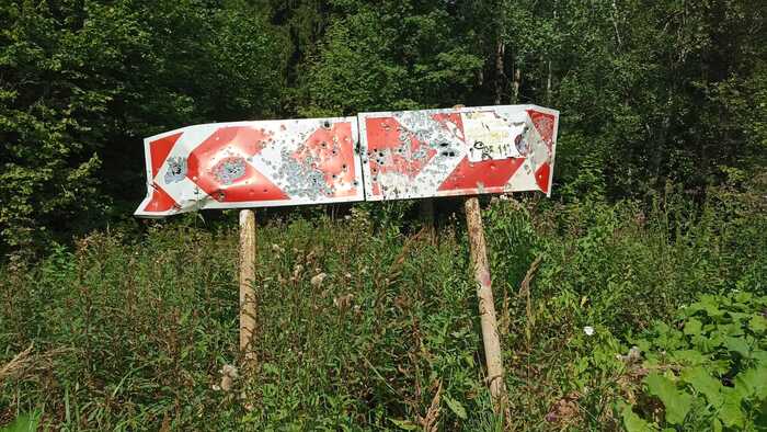 Пройдя где то пол пути через лес в сторону дач мы упираемся в поворот, который перекрыт старым тяжёлым шлагбаумом и посередине дороги навалена куча песка, хотя явно видны следы протэктэров, которые проезжали по этой куче в глубь лесной дороги, справа есть объезд, но скорее всего сделан он подростками из военного городка, которые там гоняют на квадрациклах, а вот что притягивает внимание, так это табличка...жутковато, не правда ли?