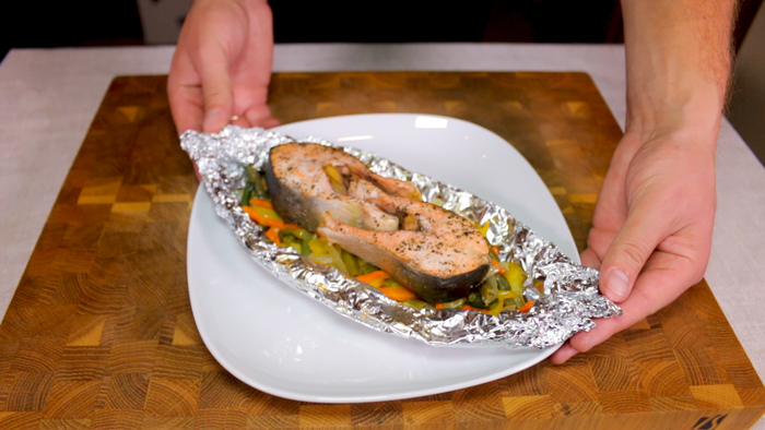 Помещаем их в духовку, которую мы чуть ранее поставили разогреваться до 200 градусов на 15 минут. По прошествии указанного времени вынимаем лодочки с рыбой из духовки и аккуратно, чтобы не обжечься, раскрываем их. В таком виде отправляем горбушу с овощами в духовку ещё на 10 минут, чтобы рыба подрумянилась.