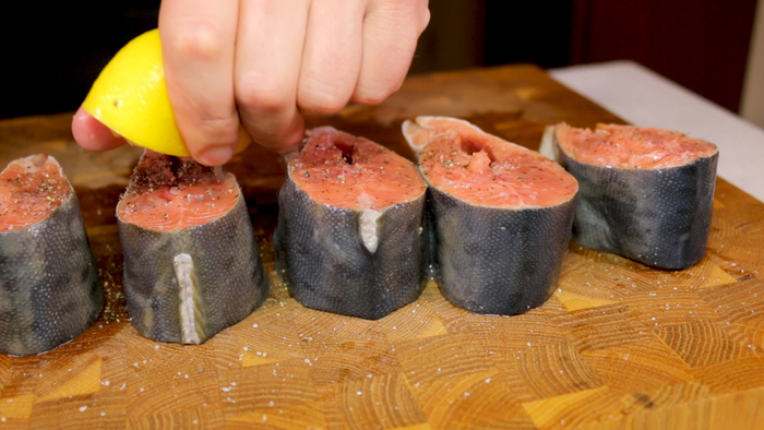 Берём тушку горбуши, у меня она потрошеная без головы и срезаем с неё плавники. Отрезаем хвост, а саму тушку рыбы разрезаем на порционные кусочки толщиной примерно 4 см. Получившиеся стейки из горбуши присаливаем достаточным количеством соли и приправляем свежемолотым перцем, а также поливаем их лимонным соком и убираем в холодильник подмариноваться.