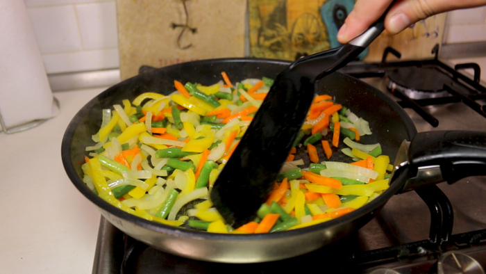 Ставим сковороду на сильный огонь. Наливаем в неё масло и даём ему разогреться. Помещаем нарезанные овощи в сковороду с разогретым маслом добавив к ним 100 гр замороженной фасоли. Пассируем всё вместе в течении 5 мин помешивая. Затем присаливаем овощи, перемешиваем и снимаем с огня.