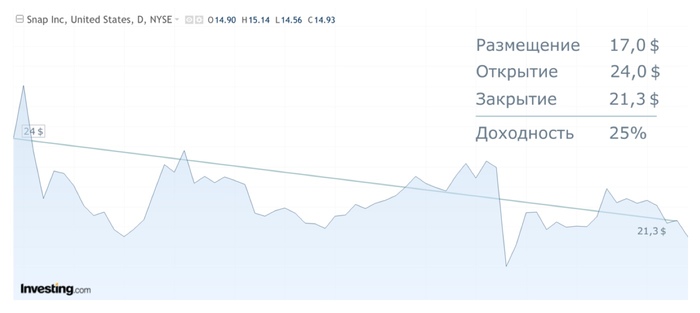 Snapchat в итоге закрылся на +25%. Если бы я тогда знал, что это за компания, вложил больше – кто его знает, может, больше бы одобрили.